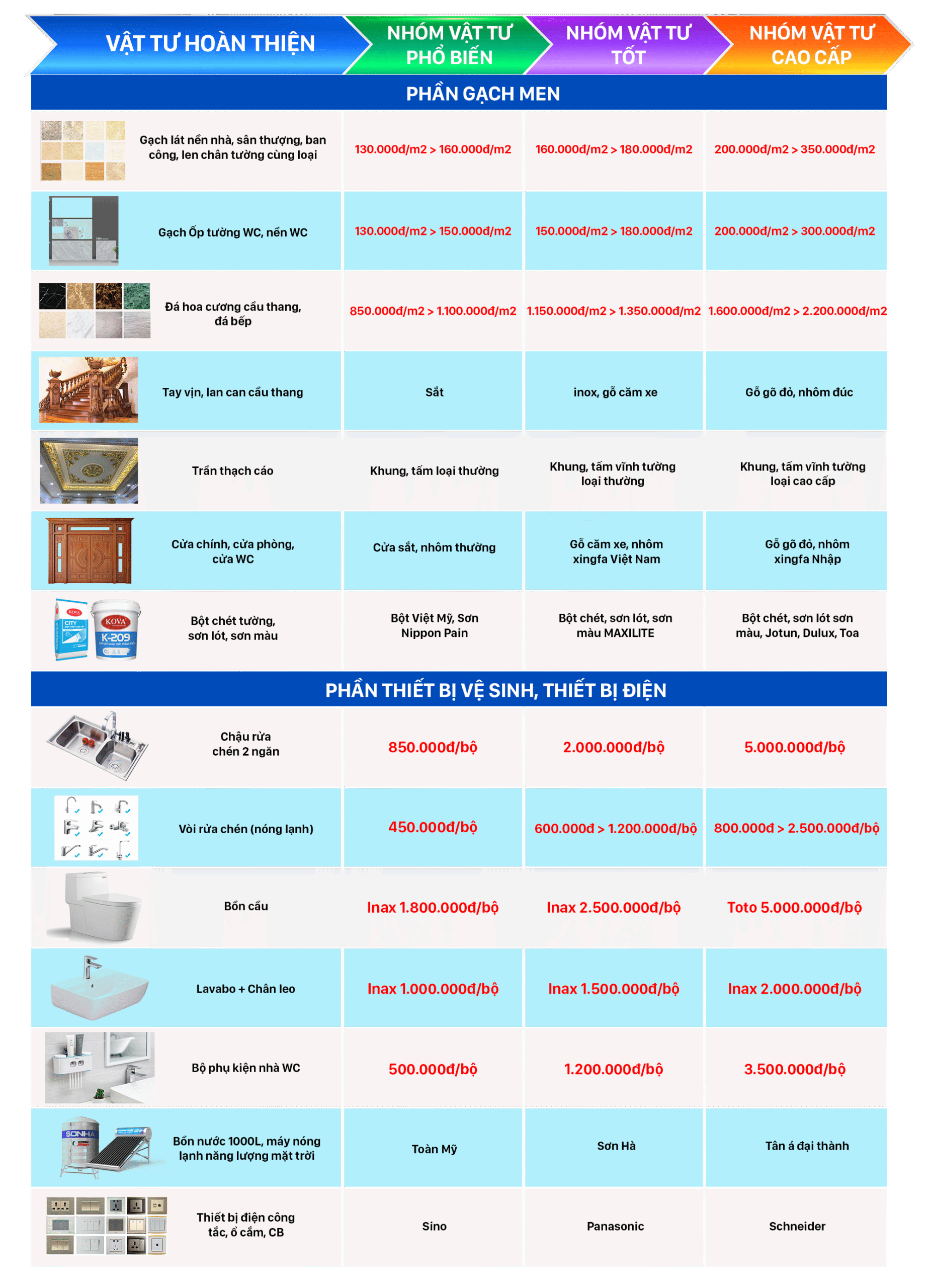 - Nhóm vật tư phổ biến: Giá xây nhà trọn gói có chi phí khoảng