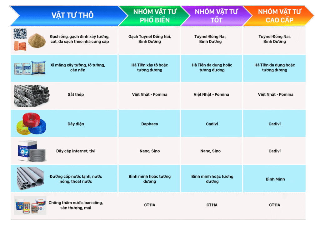 Tùy thuộc vào từng chủng loại vật tư mà gia chủ lựa chọn, đơn giá xây nhà trọn gói TPHCM của Hạ Trường được chia thành 3 nhóm, gói vật tư chính như sau: